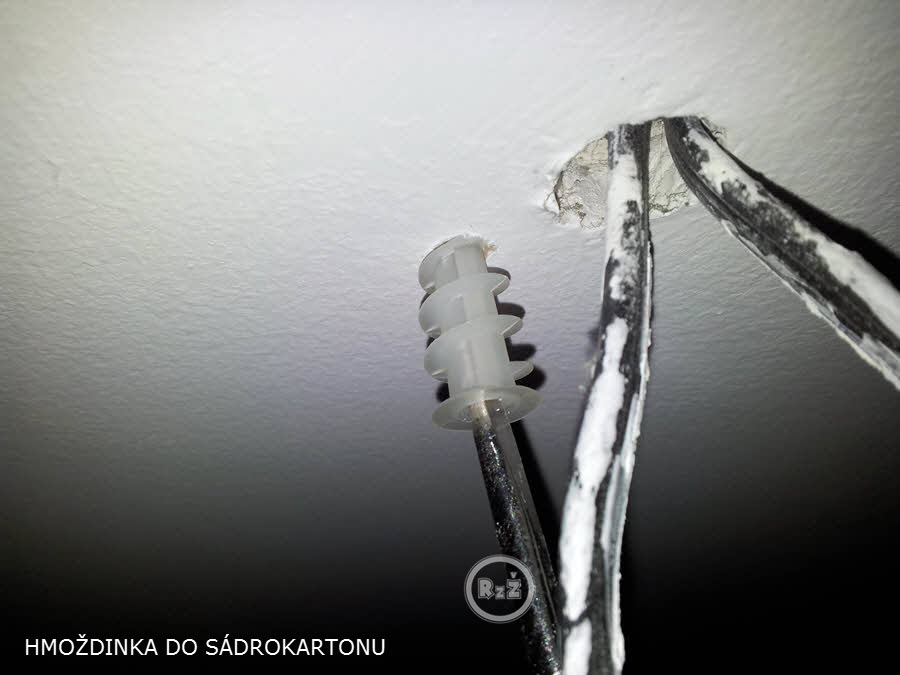 Nemám dlouholeté zkušenosti s vrtáním do sádrokartonu, ale po pár zkušenostech se mi osvědčilo předvrtat menší otvor a hmoždinku do otvoru našroubovat. Díky menšímu otvoru hmoždinka krásně napevno do otvoru zaleze. Do hmoždinky zatočte háček s vrutem tak, aby mezi stropem a háčkem zbylo jen málo místa – tak, aby bylo možné držák světla (lustru) na háček pověsit a zakrýt nehezké upevnění. Při koupi háčku myslete na to, aby měl rozměry takové, jaké potřebujete.