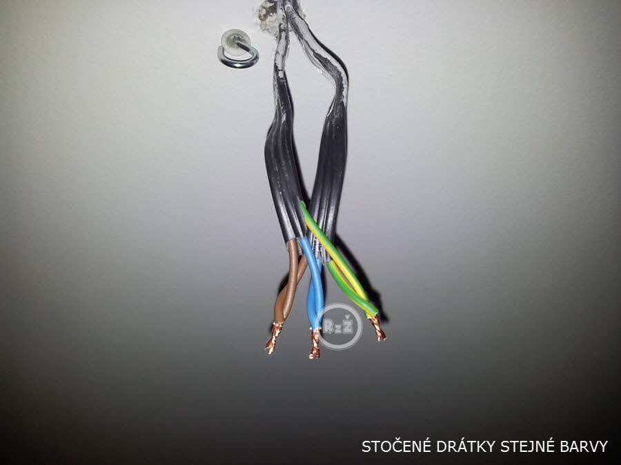 Ze smyčky vznikly 2 kabely, přičemž z každého trčely 3 barevné dráty (zelenožlutý – PE – nulák (bez proudu-zemnění-nemůže kopat), hnědý – L – fáze (ten co kope), modrá – N – nulový vodič (neměl by kopat)*. Tyto 3 barvy by se měly vyskytovat nejčastěji. Také jsou ale možné jiné variace, zejména u starších elektroninstalací. Pak doporučuji buď tuto diskuzi zde a nebo elektrikáře (odborníka). Tento postup je zaměřen především na nejčastěji se vyskytující připojení světla.