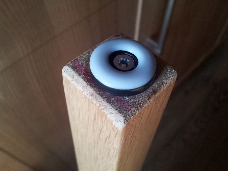 Varianta, kterou jsme odzkoušeli, jsou ochranné podložky kruhového tvaru složené z gumy, kovové podložky a z umělé hmoty (gumovo-plastové podložky). Uprostřed podložky je otvor, který slouží k upevnění k židli. Podložku, kterou můžete vidět níže, je nutné přišroubovat k nohám židlí. Pouze díky přišroubování jsou podložky skutečně dobře upevněné k nohám židle. Samolepící varianty se neosvědčily, jejich fixace není dostatečná. Obrázkový postup upevnění podložek včetně podoby podložek vkládám níže.